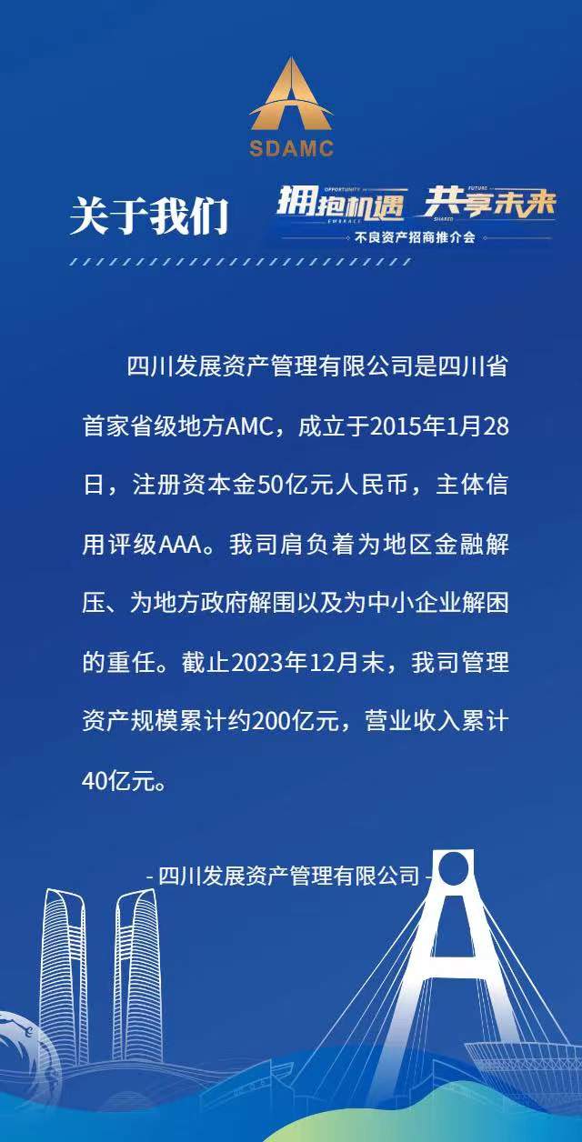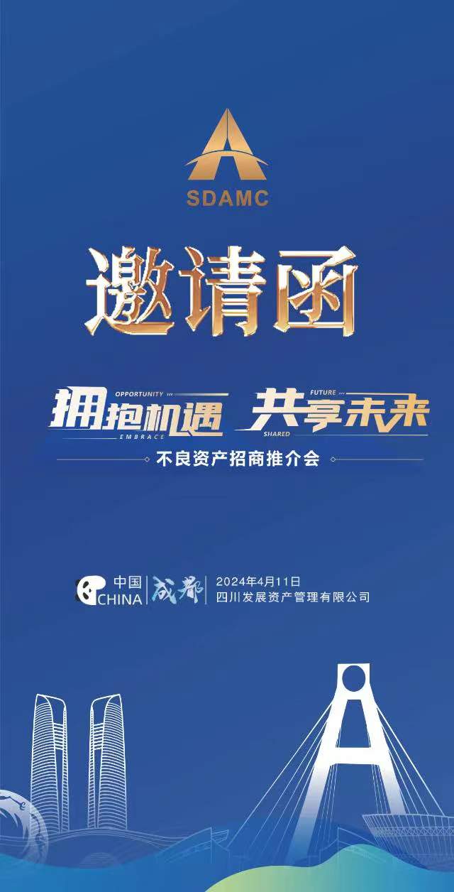 4月11日,四川發(fā)展資產(chǎn)管理有限公司將在成都高新區(qū)交子國(guó)際酒店舉辦“2024年不良資產(chǎn)招商推介會(huì)”,誠(chéng)邀您的參與。